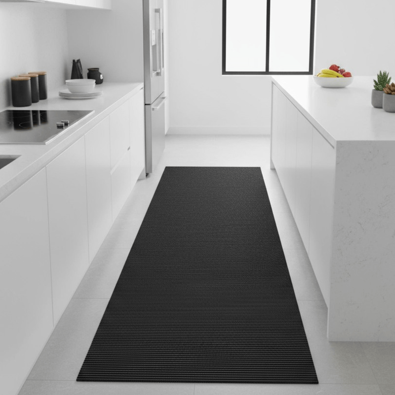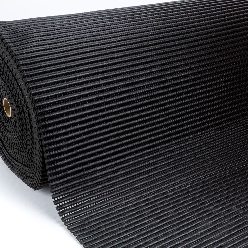 Com uma tonalidade preta e uma gravação canelada, esta passadeira é antimofo, higiênica, fácil de limpar (apenas com detergente neutro e pano úmido) e possui secagem rápida.