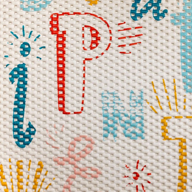 Sua superfície possui uma gravação antiderrapante, e sua estrutura "soft" garante alta absorção de impacto, conforto e um agradável efeito massageador, tornando-a perfeita para brincadeiras.