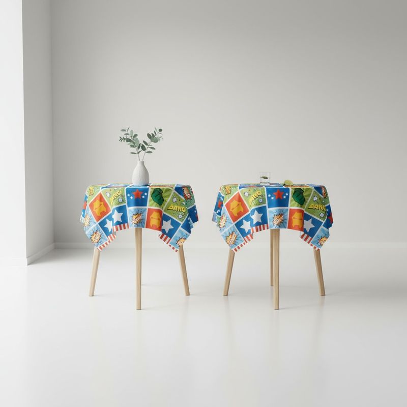 Fabricado em polipropileno (TNT - Non-woven), este tecido com acabamento fosco apresenta um vibrante tema de Super Heróis em tons de azul, vermelho e verde, com o vermelho como cor predominante.