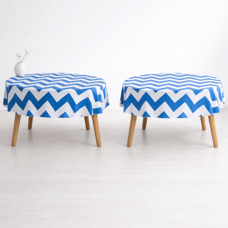Fabricado em polipropileno (TNT - Non-woven) com acabamento fosco, este tecido apresenta um moderno tema chevron em tons de azul e branco, com o azul como cor predominante. É um produto multiuso, vendido por metro linear em rolos de 50 metros com 1,40m de largura, e vem acompanhado de embalagem plástica. Embora seja conceitualmente descartável, pode ser limpo pontualmente com um pano úmido.