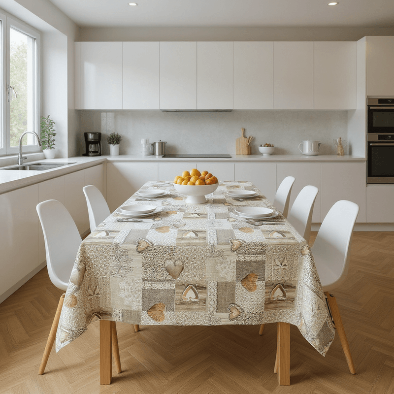 Além de servir como toalha de mesa, seu material versátil permite diversas aplicações criativas, como decoração e capas de proteção, adicionando charme e funcionalidade.
