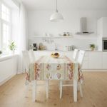 Com uma encantadora estampa temática de chá da tarde em tons de bege e vermelho, onde o bege é a cor predominante, e um acabamento fosco, esta toalha de mesa se alinha às tendências do mercado, trazendo um ar acolhedor e charmoso.