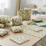 Este produto de alta qualidade se destaca por estampas da moda e cores vibrantes, apresentando um moderno tema Geométrico em tons de azul, cinza e branco, com predominância do azul.