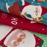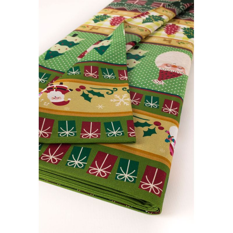 Com uma encantadora estampa de Natal em cores vibrantes como verde (predominante), vermelho e amarelo, este tecido é perfeito para dar vida às suas ideias festivas.