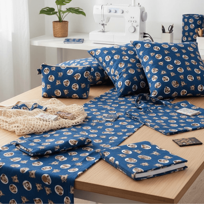 Este produto de alta qualidade se destaca por estampas da moda e cores vibrantes, apresentando um charmoso tema Pets em tons de azul, bege, marrom e branco, com predominância do azul.